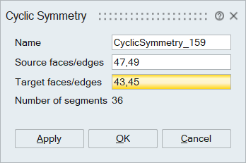 After selecting the Source and Target entities, if the mesh on both entities is symmetry, then the angle between the entities is internally computed and listed in the dialog and if not symmetry then it throws the error message and if the mesh is same.