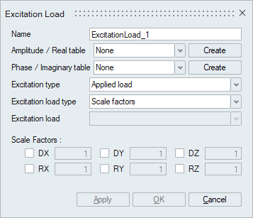 *Base Motion, Dof = {DOF}, Amplitude = {Amplitude name}, {Real/Imaginary} (If Excitation load type = scale factors) *Base Motion, Dof = {DOF}, Type = {Accleration / Velocity / Displacement}, Base Name = {Base name}, Amplitude = {Amplitude name}, {Real/Imaginary} (If Excitation load type = Enforced constraints) *Cload, Amplitude = {Amplitude name}, {Real/Imaginary} (If Excitation load type = Force) *Dsload, Amplitude = {Amplitude name}, {Real/Imaginary} (If Excitation load type = Pressure) *Dload, Amplitude = {Amplitude name}, {Real/Imaginary} (If Excitation load type = Body force) *Amplitude (Amplitude table - Freq Vs Excitation Real type; Phase table - Freq Vs Excitation Imaginary type) |