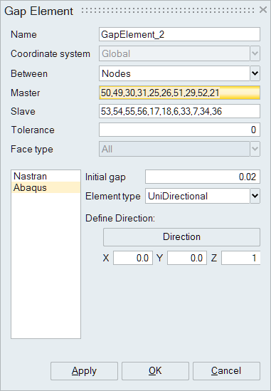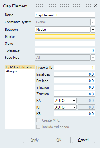 Gap Elements for OptiStruct / Nastran (or) Abaqus solvers can be defined.