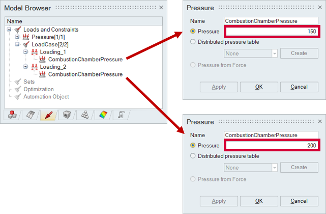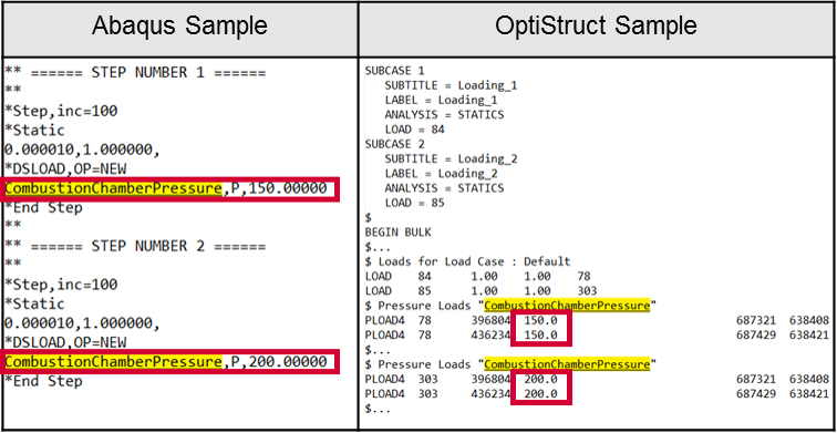 Load / Constraint Solver Supported Cards Pressure magnitude Abaqus *Dload / *Dsload Body force > Centrifugal force magnitude Permas $INERTIA ROTATION Surface interaction > Friction magnitude Abaqus *Change friction Pretension Force Abaqus *Cload OptiStruct PTFORCE Pretension Constraint Abaqus *Boundary OptiStruct PTADJUST Contact Abaqus *Model change,Type=Contact pair,Add/Remove OptiStruct MODCHG, CONTACT