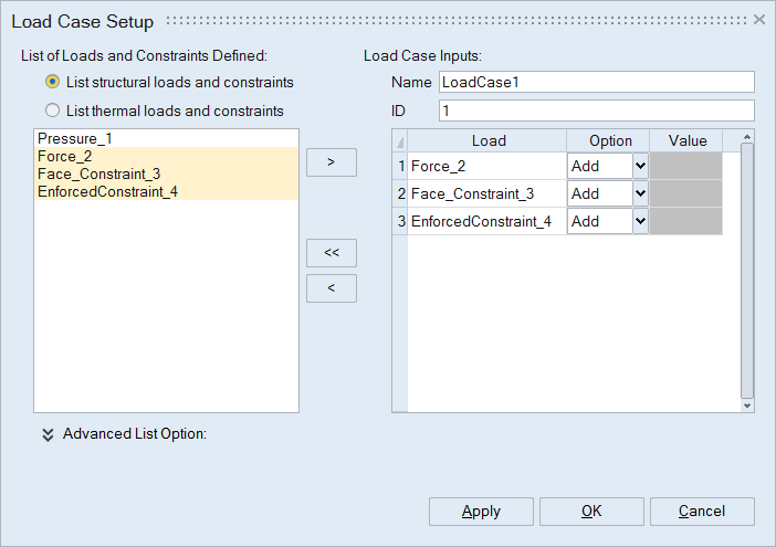 - The loads and constraints are segregated based on structural and thermal analysis types and listed in the load case dialog.