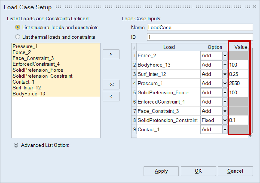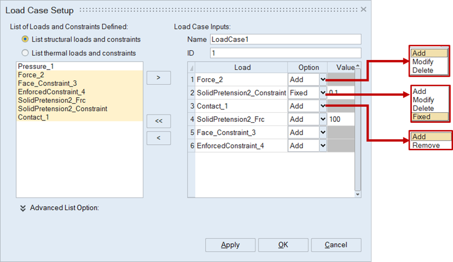 - Contact and connectors can be included in the load case by using the advanced list option.