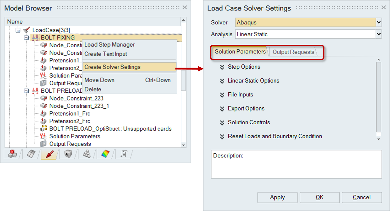 This tool is used to group loads and constraints and create different loading combinations. Each load case can be of different analysis type. Solution control parameters and output requests for each load case can be specified.