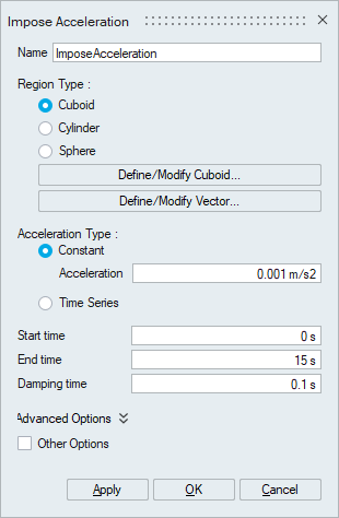 The impose acceleration region imposes a defined acceleration on all the particles which are within the defined region. It also can be thought of as a momentum source region, except that by defining the acceleration instead of hard setting the velocity of the particles, the region is likely to behave more stably.