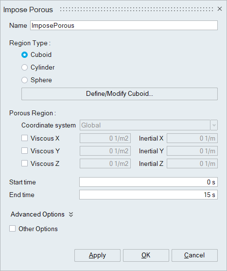 Impose porous definition follows the well-known Darcy-Forchheimer model and allows for definition of volume averaged isotropic or non-isotropic porous media.