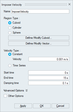 - Time Series - Defines variable velocity inside the imposed region.
