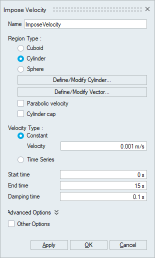 Damping Time - This parameter specifies a time window for the acceleration of the fluid. At the start time the velocity will ramp up from zero to the specified value over this time. This minimizes pressure fluctuations and instabilities caused by instantaneous changes in velocity.