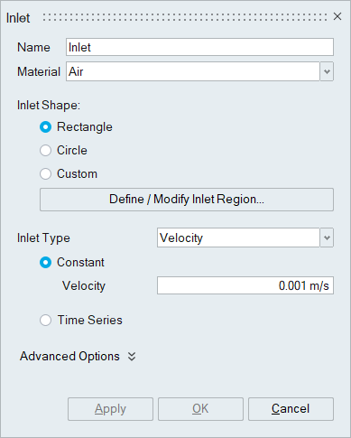 Inlet regions can be defined in rectangular, circular or custom shape. The only limitation to the inlet regions is that they must be planar, even in the custom shape or arbitrary orientation scenario.