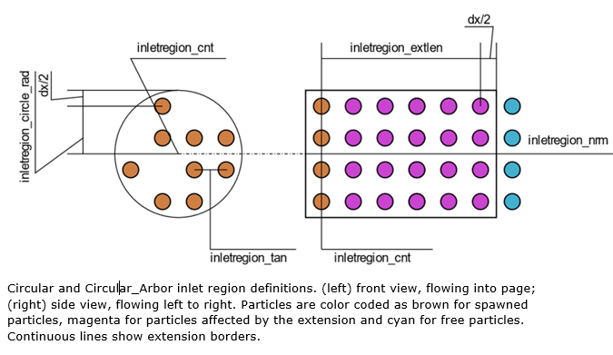 The extension covers up to half dx, further in each direction than the definitions given in the cfg to ensure all spawned inlet region particles are covered. The fluid particles within the extension have the same velocity as the inlet region. It is important that the spawn area is not disturbed by other fluid particles. The extension only applies to the fluid phase specified for that specific inlet region.