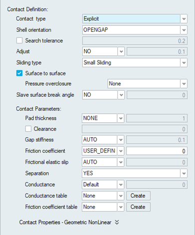 • Explicit Contact Type: Defines the properties of general (PCONTX) and type 24 (PCNTX24) of a CONTACT interface for geometric nonlinear analysis.