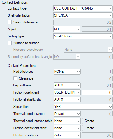• Friction Coefficient: Used to specify friction conditions between contact surfaces. It can be STICK / FREEZE / User defined friction coefficient.