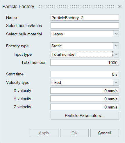 The Particle Factory panel is used to specify the inflow boundary condition for Particle flow simulations.
