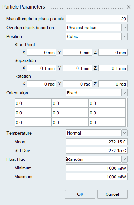 | Heat Flux | Specifies the heat flux of the Particle | Fixed | Value in W |