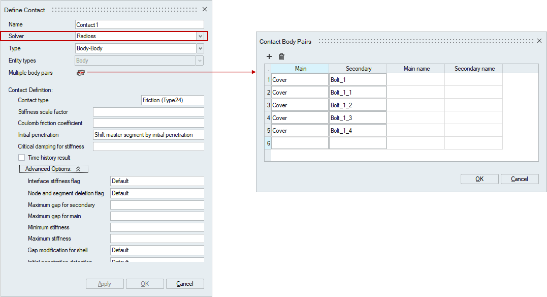 Multiple body pairs: This option allows to select multiple body pairs to define contact. This option is listed only in the manual contact definition.
