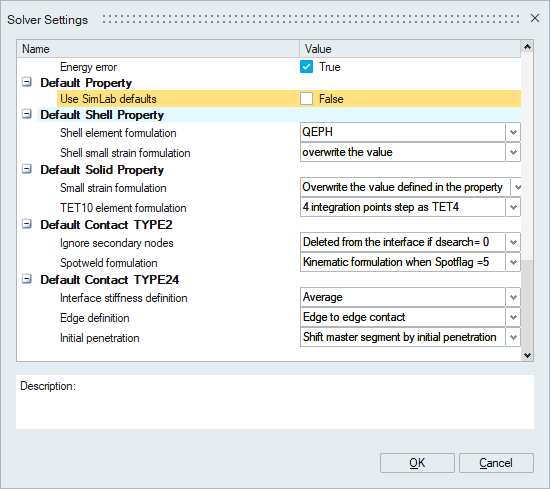 Default contact parameters can be modified in the setting “Solver Settings” dialog.