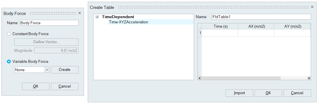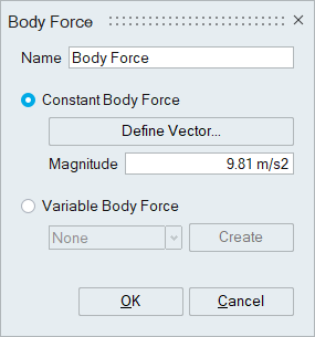 For constant Body force, the vector and magnitude must be specified. By default, the magnitude is 9.81 m/s2. It can be specified in the desired direction using a vector.