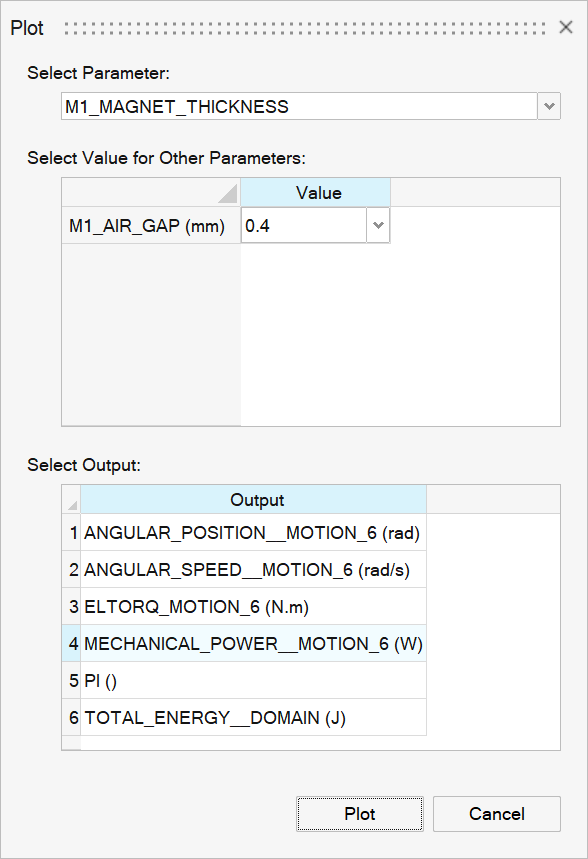 As shown below user needs to choose a parameter along with this user needs to specify fixed values of other parameters that have been used for the DOE runs. User also needs to select the output variable shown on the ordinate axis.
