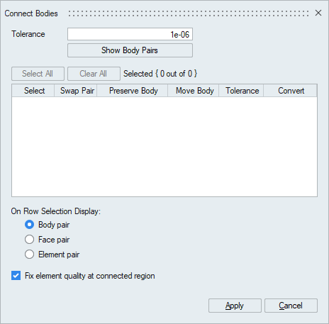 One can find all the body pairs that are touching within a tolerance. Once identified, they can be connected. To use this function, first select the bodies. Then select Show Body Pairs and this will display the bodies, as pairs, that are touching within tolerance. From the list of body pairs, one or more can be selected and the bodies connected by selecting Apply. For each body pair if there is a gap or intersection, one body can be set to Preserve Body (will not move) while the other will moved. This is enabled by checking the Swap Pair toggle in each row. The tolerance for each row can also be specified prior to invoking the function.