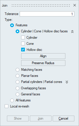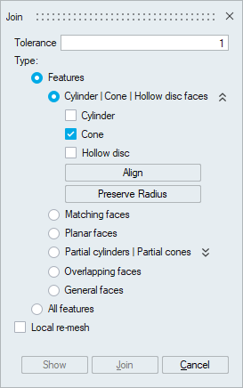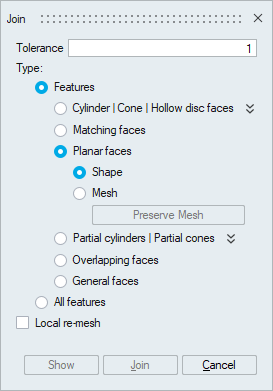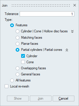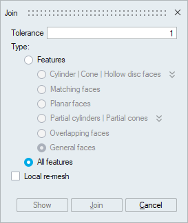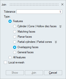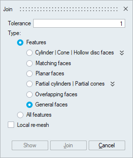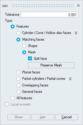 Faces having non-identical mesh but identical geometry(shape) can be joined using this option.