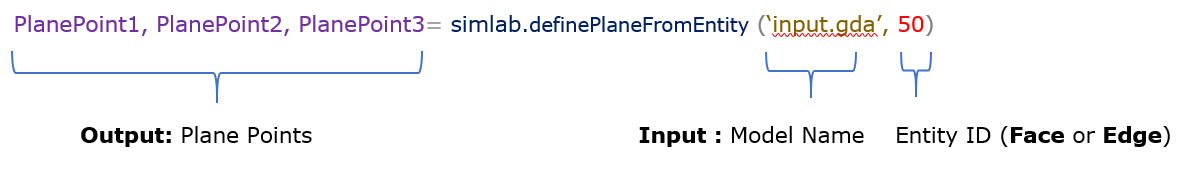 PlanePoint1,PlanePoint2,PlanePoint3 = simlab.definePlaneFromEntity('ModelName', "EntityID(Face ID (or) EdgeID)")