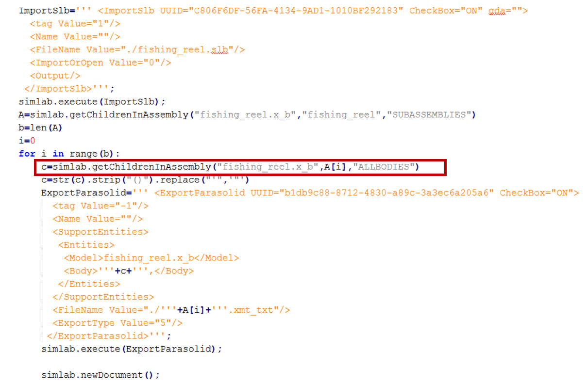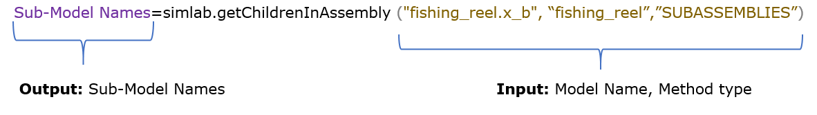 OutputList = simlab.getChildrenInAssembly("ModelName","ModelName or SubModelName","Method Type(SUBASSEMBLIES or BODIES or ALLBODIES)")