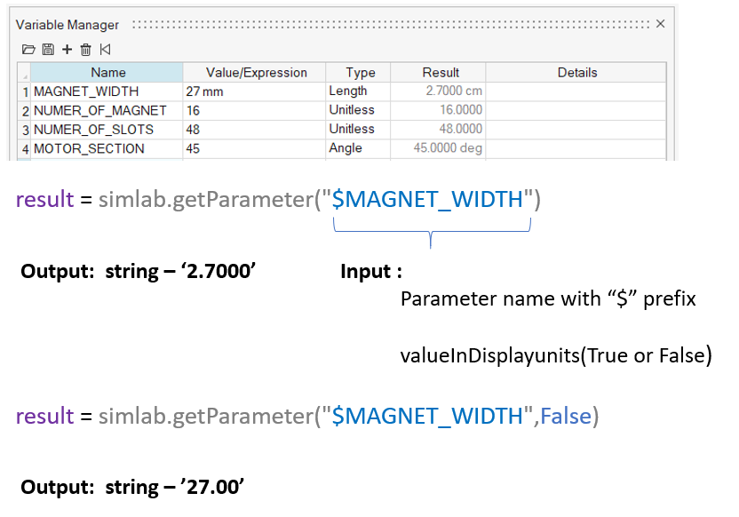 result = simlab.getParameter("SimLab Parameters",valueInDisplayunits (True or False))