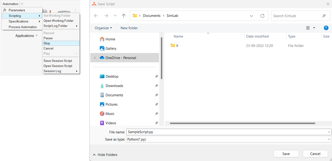 Stop button will stop the recording and allow to save the script. It will automatically open the working folder during recording and save the recording with the specified name.