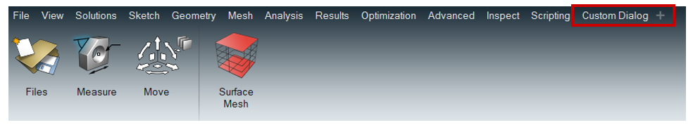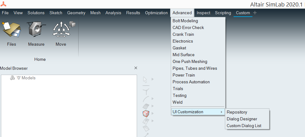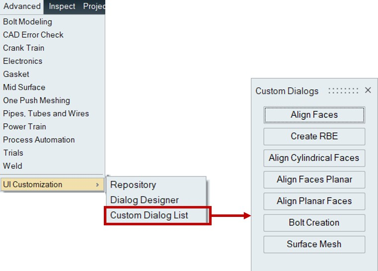 The options under Advanced > UI Customization are used to create customized dialogs inside SimLab by linking the python script to execute the process. These custom dialogs will be listed under the custom dialog list.