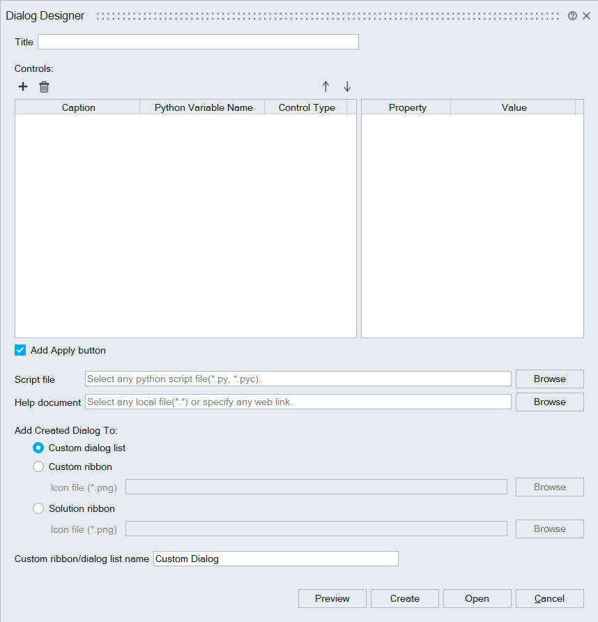 Open button will take you to the repository folder location. This will allow to select the existing custom dialog and enhance. Also, it will update the custom dialog modification in repository.