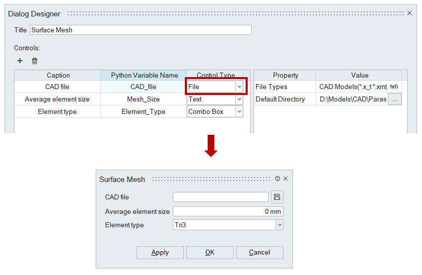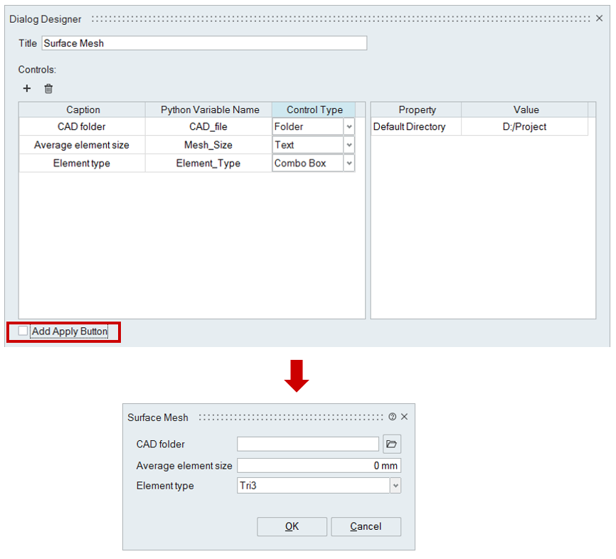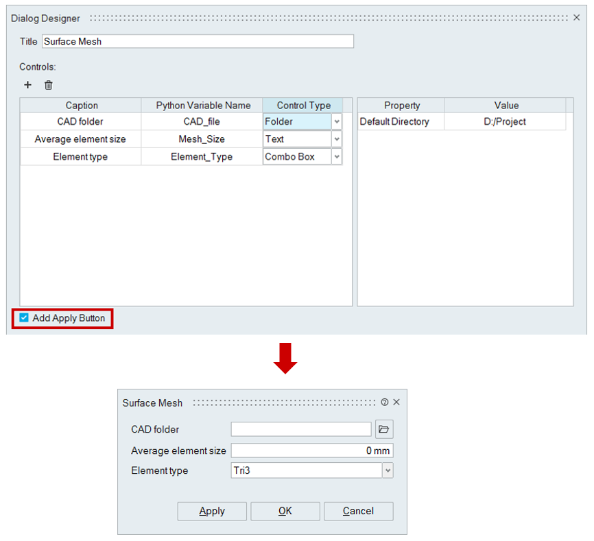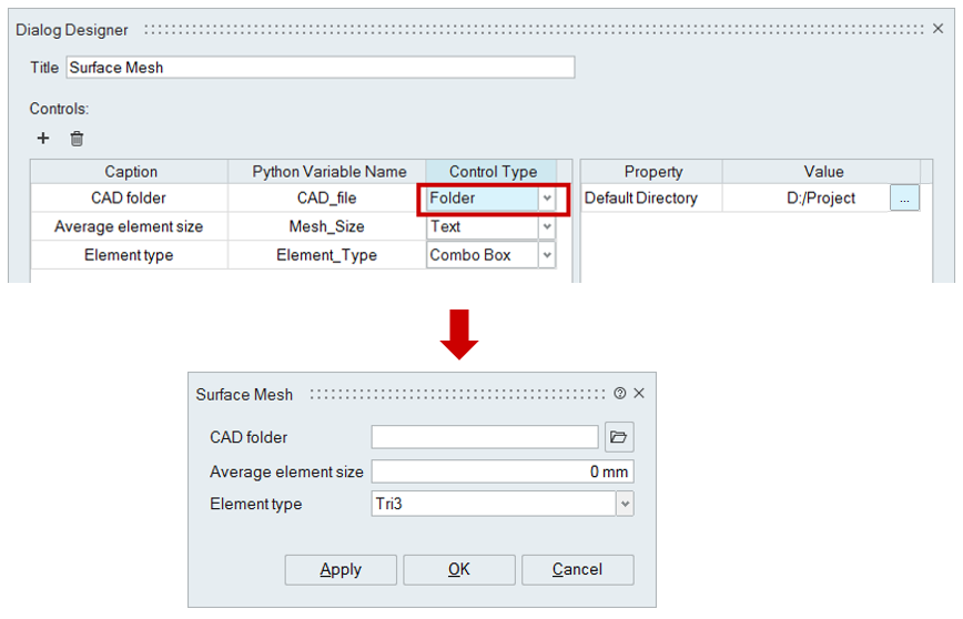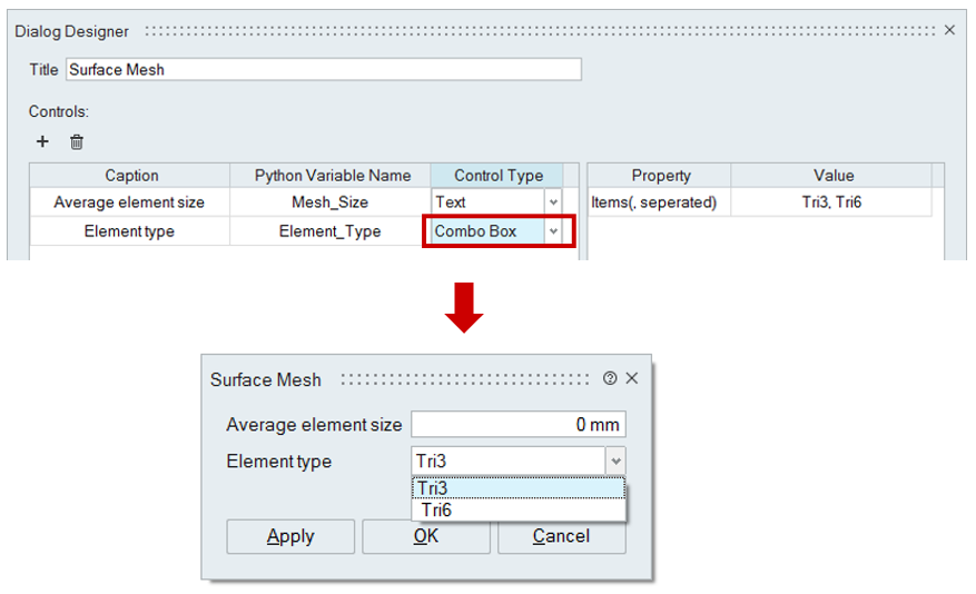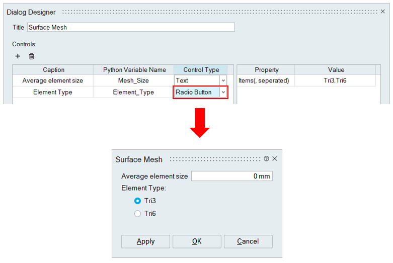 Example: To mention the element type to generate surface mesh, combo box option can be set.