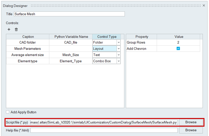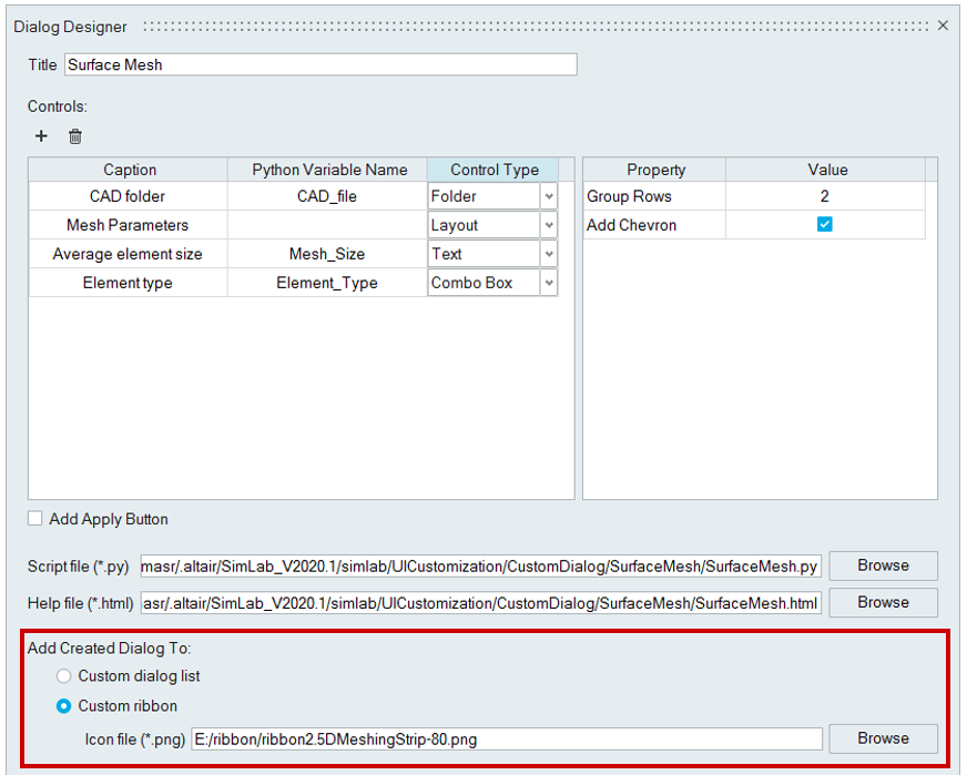 Repository is used to store the files related to the created custom dialogs. By default, the repository is set to ".altair" folder.Default repository will be "C:\Users\<username>\.altair\SimLab_V2019.2\simlab\UICustomization". The repository can be set to the user defined folder.