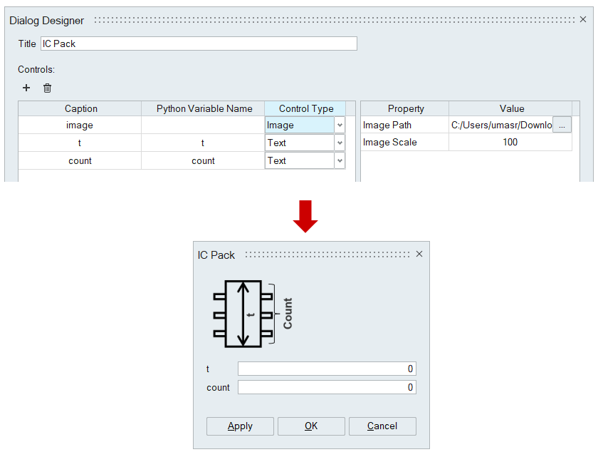This control is useful when the user needs to display an image in the dialog. The user should select an image. The default size of the image in the dialog will be the actual size of the selected image. The user can resize the image using the "Image Scale" attribute. The default value is 100, which corresponds to the actual size of the image. The image scale value should be greater than zero.
