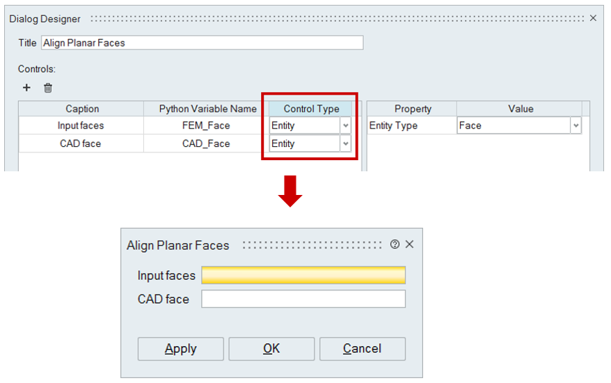 Example: For aligning Fem face to CAD planar face, input should be FEM and CAD face. For this case, face entity type can be set.