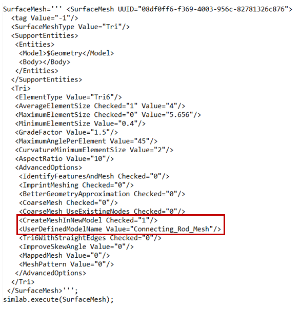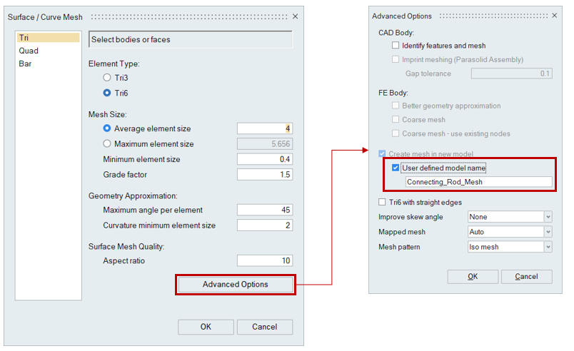 - Click on Advanced Options > Turn ON User defined model name and give "Connecting_Rod_Mesh" in line edit, then click OK.