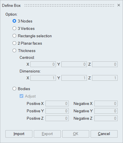 Thickness: In this option, the dimensions of the box can be specified. Pick a node or vertex. This node or vertex will be the centroid of the box. The dimensions of the box can then be edited. Instead of picking a node or vertex, the coordinates of the centroid can be entered manually.