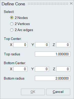 2 Nodes: Pick two nodes to define the top and bottom center of the Cone. Cone will be created at the axis of the top and bottom center.