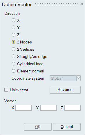 Vector can also be created by selecting 2 Nodes, 2 Vertices, Straight/Arc edges, Cylindrical face and Element normal.