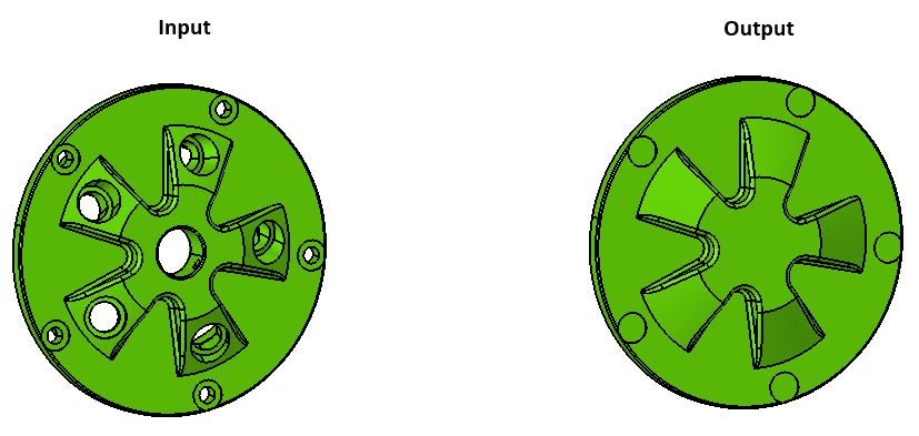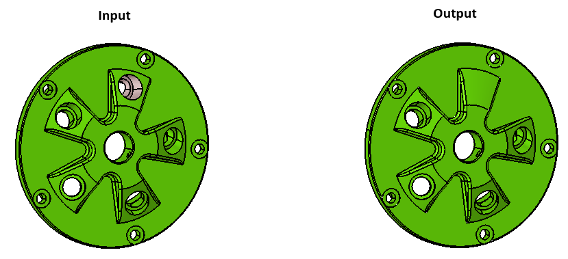 - In the case of hole removal, user can give all the faces of the hole or a face in the hole. If only a face per hole is selected, the connected faces of the hole along the axis will get identified and removed.