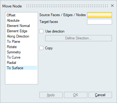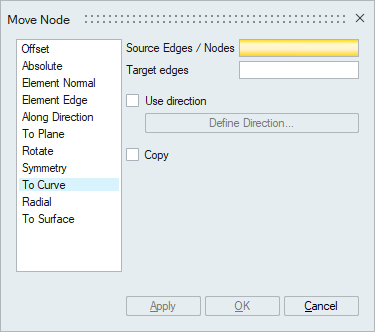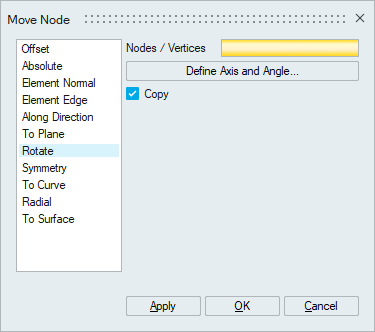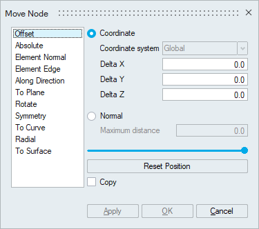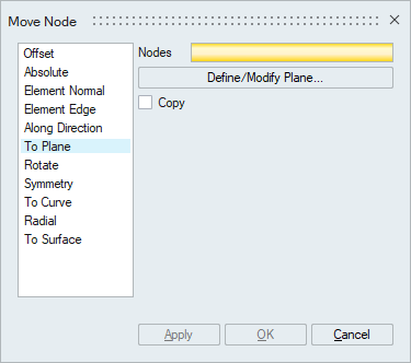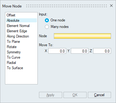 This is used to move the nodes to the specified coordinates. The coordinate values (X, Y and Z) can be entered manually or can be set by picking a node or a vertex.