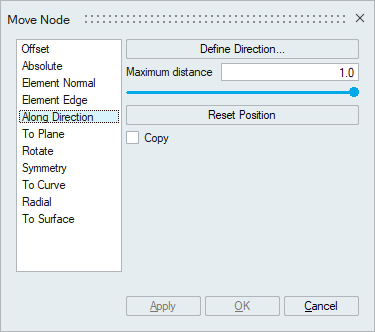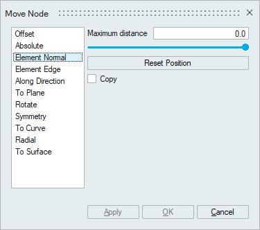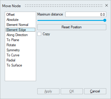 Maximum distanceMaximum distance the nodes can move. The length of the selected element edge is set as maximum distance. You can edit it.