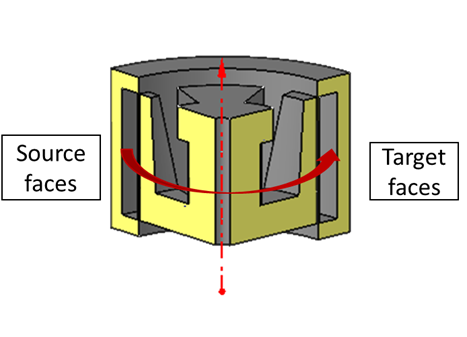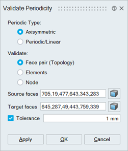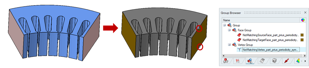 Face Pair (Topology)This option will compare the topology (vertices) of the input faces based on the periodic type, i.e., axisymmetric or linear. A vertex group will be created with the vertices for which matching vertices in the input faces are not found.