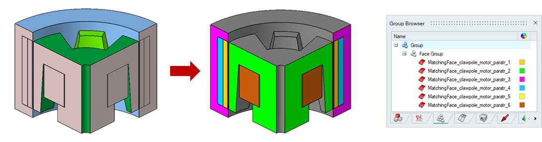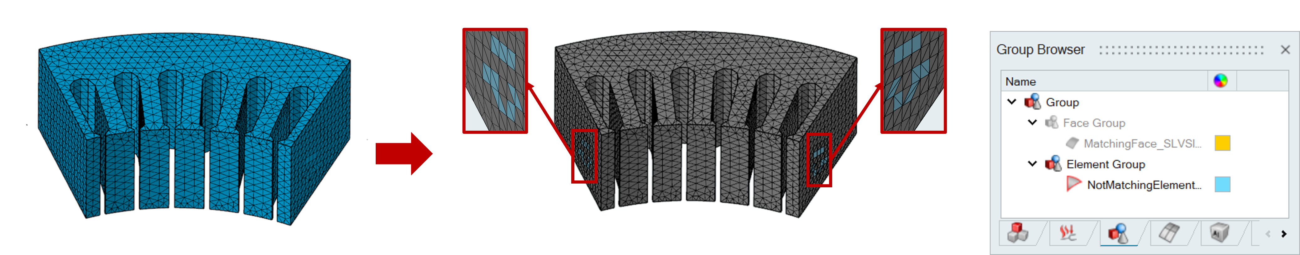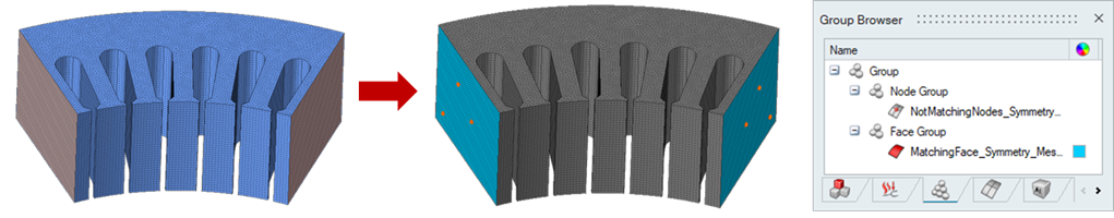 This option compares the topology (vertices) and mesh of input faces based on their periodic type, such as axisymmetric or linear. The process involves first verifying if the topology (vertices) of the input faces is identical. If the topologies match but the meshes do not, an element group is created for elements without matching counterparts in the input faces. If the topologies do not match, only a vertex group is created. This method ensures that any discrepancies in the mesh or topology are identified and categorized appropriately.