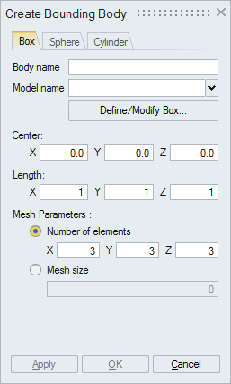 This tool is used to create a mesh body (bounded) using a box which can be defined using Define/Modify Box button. The box can be modified by changing the length along x, y and z directions. Number of elements or mesh size can be given to define mesh along x, y and z direction.