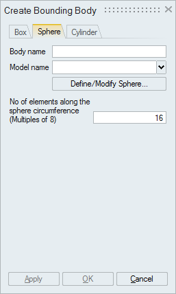 This tool is used to create a mesh body using a sphere which can be defined using Define/Modify Sphere button. The number of elements along the sphere circumference can be specified.