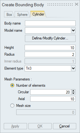 This tool is used to create a mesh body using a cylinder which can be defined using Define/Modify Cylinder button. Number of elements or mesh size can be given to define mesh size along circular and axial direction.