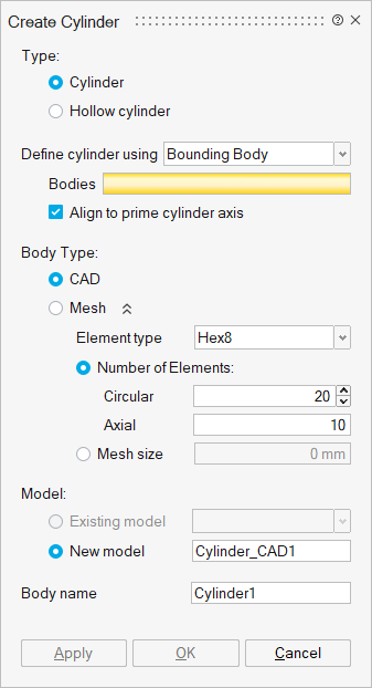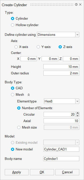 - Element Type: To create a mesh cylinder, user can specify the element type as Tri3, Tri6, Quad4, Wedge6, Tet4, Tet10 and Hex8.