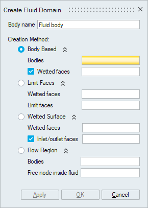 This option is used to create fluid domain using the selected bodies and an orphan node inside fluid region. The input bodies must be volume meshable and should enclose the fluid domain without any leaks.