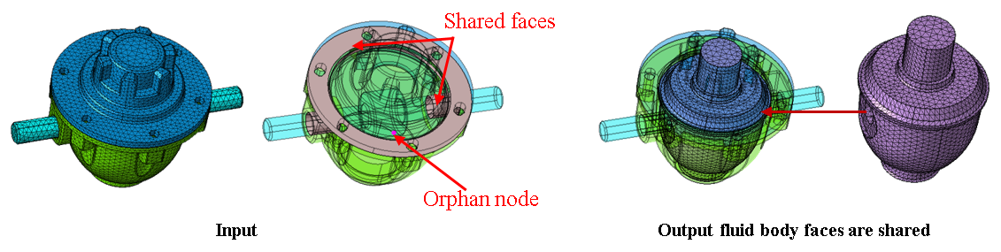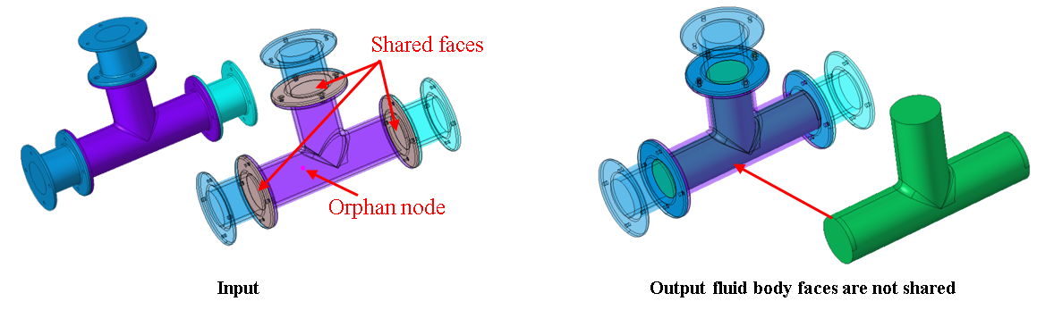 If fluid domain faces in the input bodies are not part of the shared faces, then the newly created fluid body will have its faces shared with the input bodies.