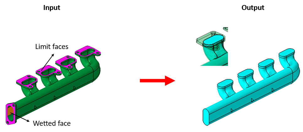 The fluid domain from a body can be created by selecting limit faces (i.e., faces that bound fluid domain) and at least one wetted face in the fluid domain. Supported only for CAD Parasolid bodies imported with ‘Save geometry in database’ option.