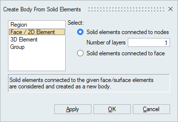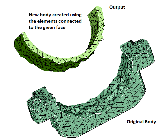 The solid elements that are connected to the nodes of the given face or 2D elements or groups are considered and created as a new body.
